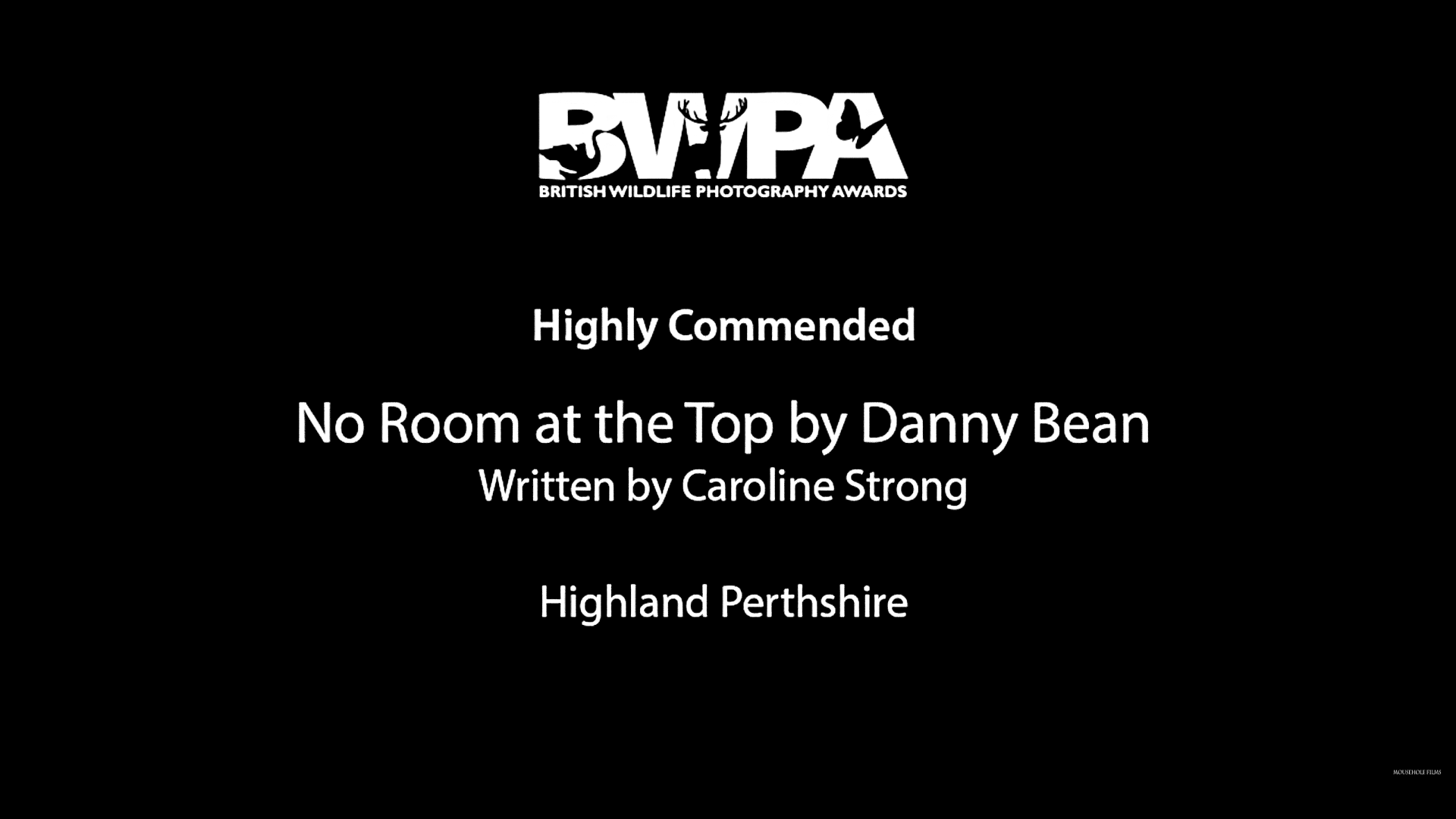 Latest documentary feature The Bough Breaks has been awarded, nominated or selected in 10 international film festivals so far, including: Winner Best Environmental Film and Best Editing at the Cinematograpy and Photography Awards 2023, Runner Up Best Scottish Production 2023 at Close:Up Edinburgh DocuFest, Nominee North Light Award and Audience Award at Montrose LandXSea Film Fest 2024, and Nominee for SDG 15 - Life on Land Award and Best Documentary Feature at the Arctic Film Festival 2024. Danny Strong (AKA Danny Bean), ecologist and wildlife cameraman, had two of his short films No Room at the Top and Morning of the Moorland Matadors Highly Commended in the British Wildlife Photography Awards.